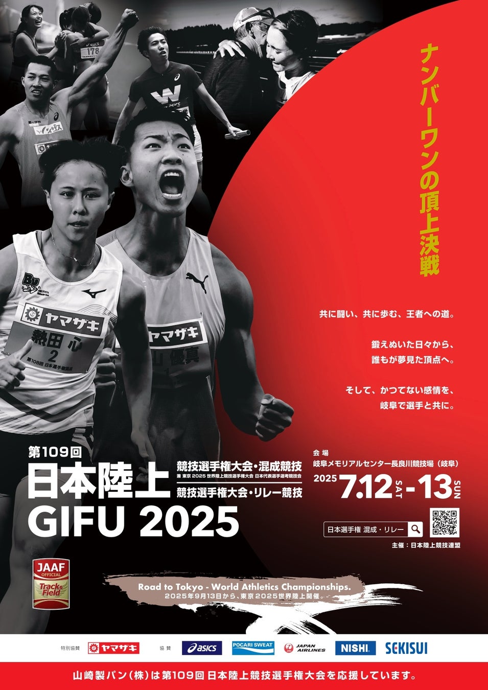 2025年7月12日(土)~13日(日)、岐阜メモリアルセンター長良川競技場で開催する「第109回日本陸上競技選手権大会・混成競技」「第109回日本陸上競技選手権大会・リレー競技」まであと50日!この度大会のキービジュアルを公開しました!