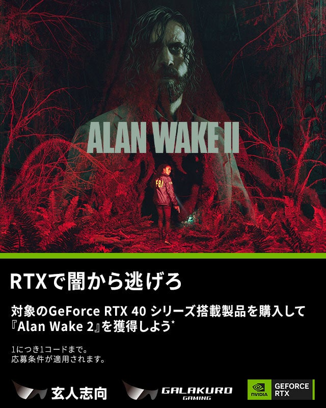 期間中、玄人志向 / GALAKURO GAMINGの指定グラフィックボードをご購入いただき、お申込みいただきますと、サイコサバイバルホラーゲーム「Alan Wake 2(アランウェイク2)」がもらえるキャンペーンを開催します。