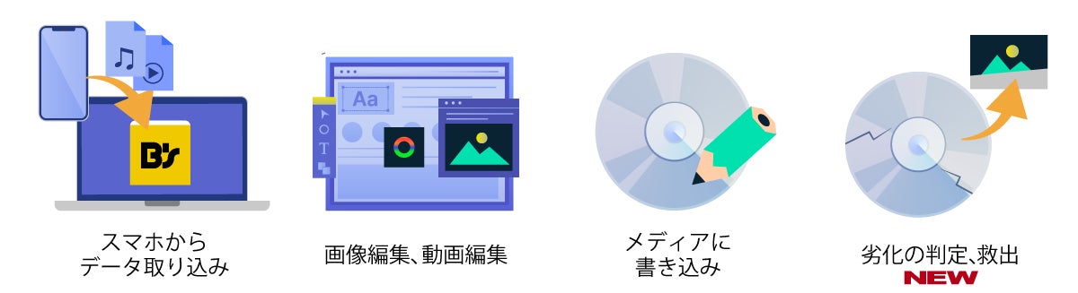 スマホから画像や動画の取り込み、web動画の録画、フォトムービーの作成など多彩な機能。さらに動画や音楽の編集や形式変換。そして、それらを「B's Recorder」でディスクにできます。