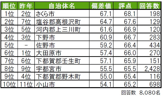 トップ3をはじめ、上位には宇都宮市周辺に位置する自治体が多数ランクインしています。