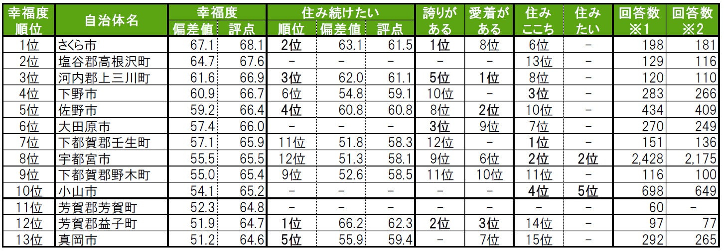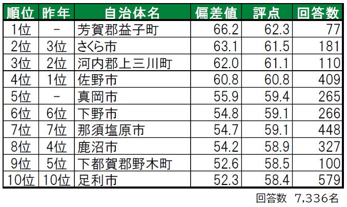 1位は、昨年は累計回答数が50名未満のためランキング集計対象外だった芳賀郡益子町で、「街に誇りがある」は2位、「街に愛着がある」では3位の評価を得ています。2位は「街の幸福度」では1位のさくら市、3位は「街の幸福度」でも3位の河内郡上三川町です。