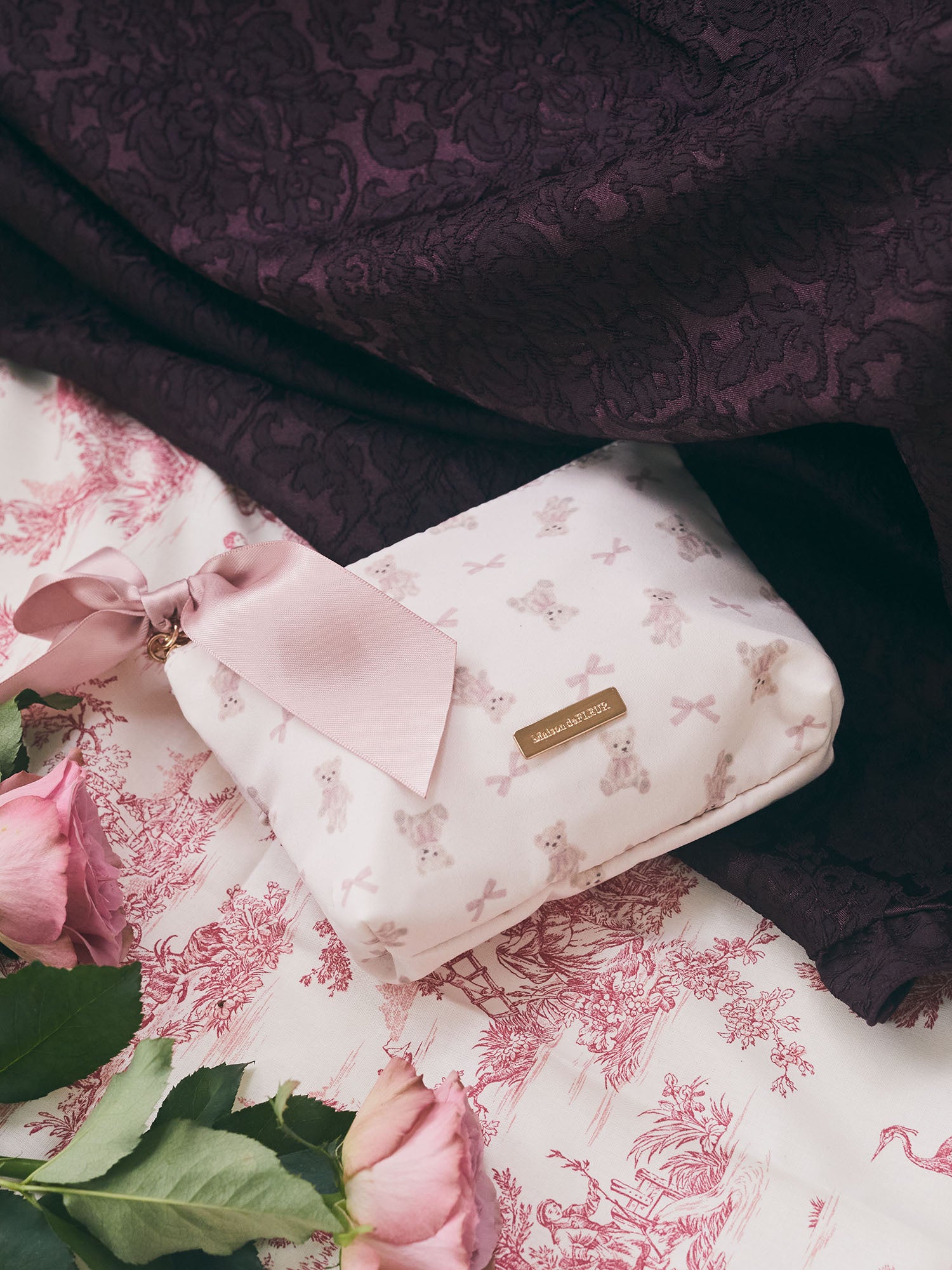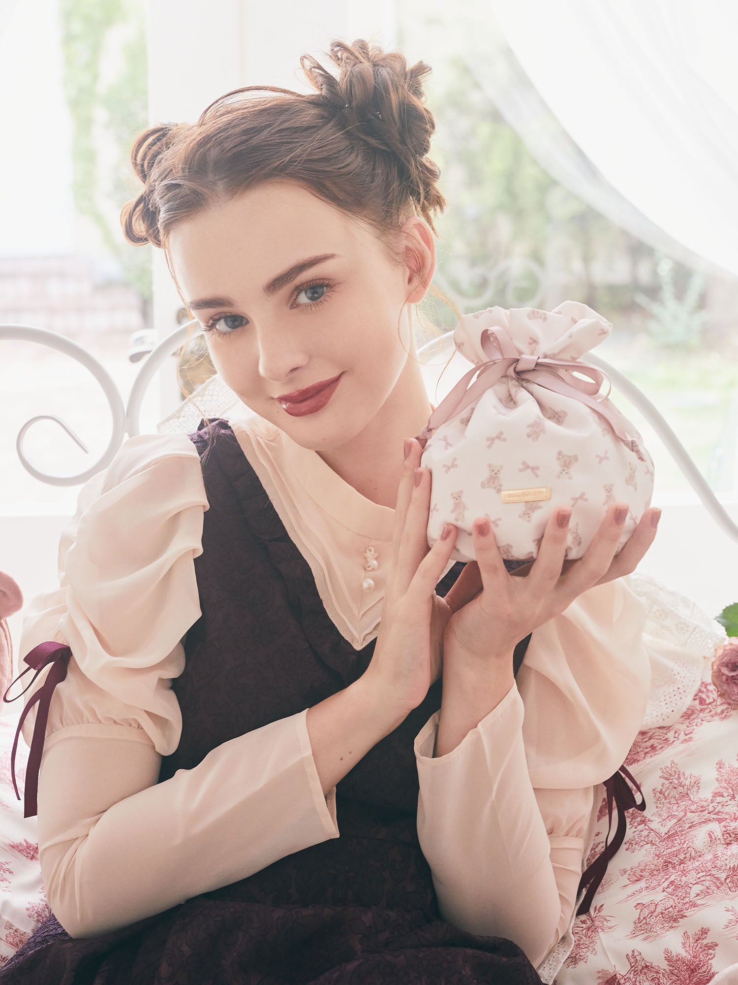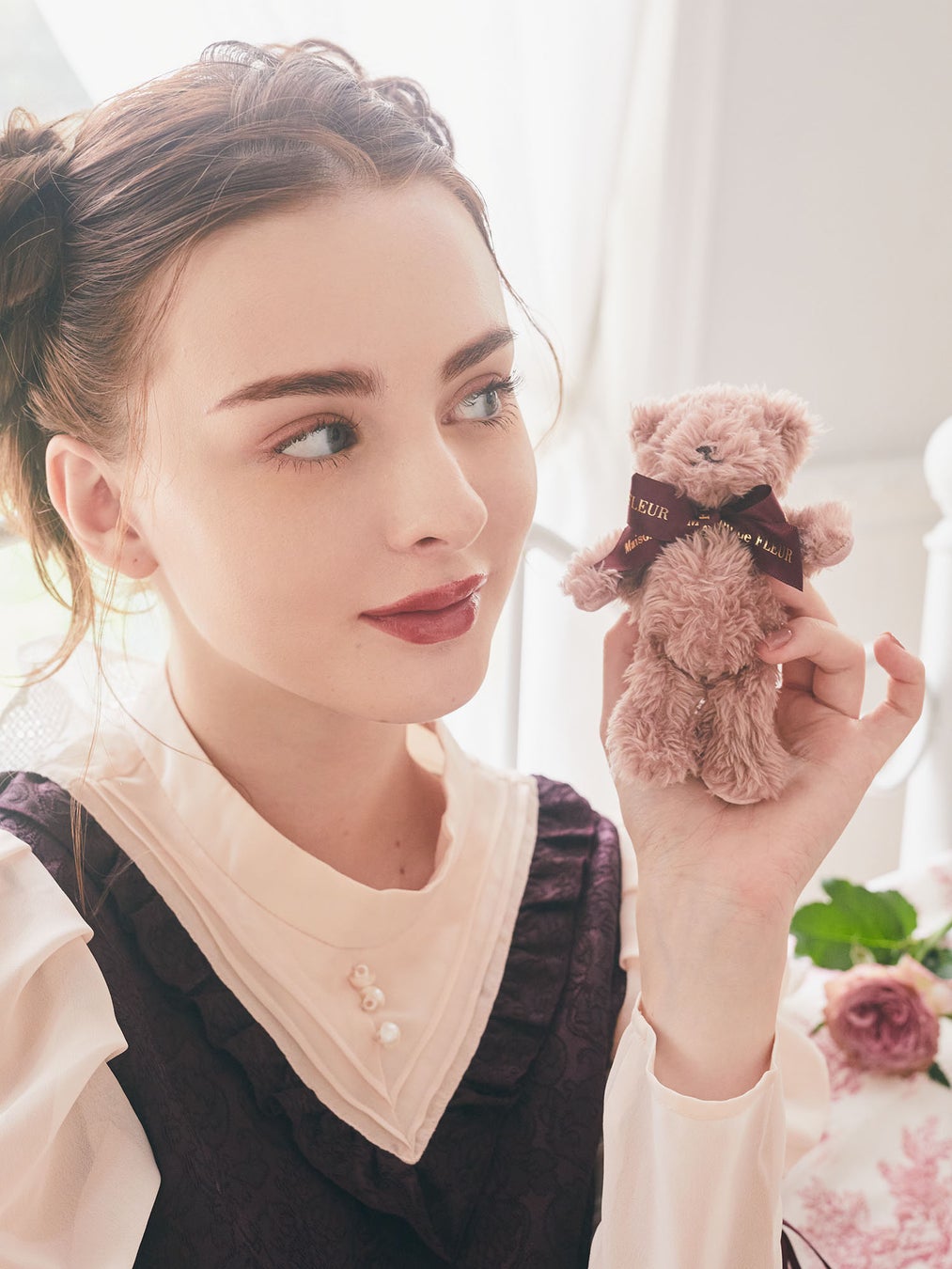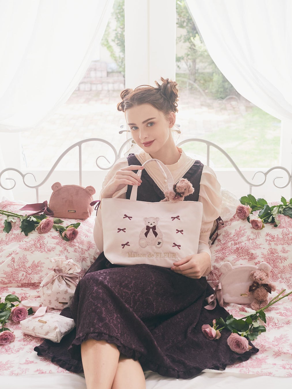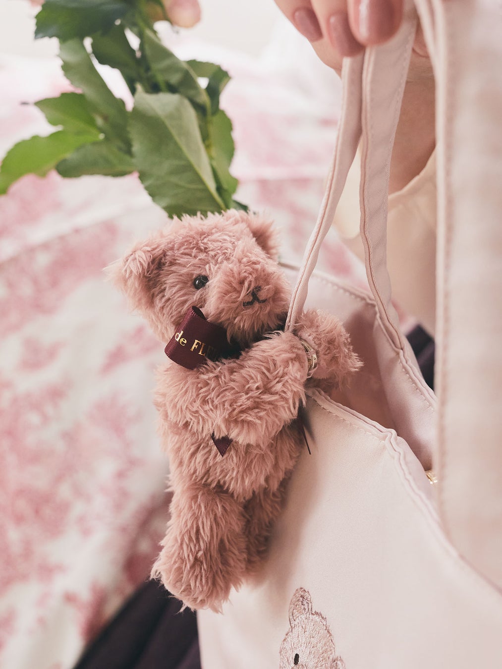 今回のシリーズは、Maison de FLEURのアイコンである“リボン”をポイントに、ピンク色で統一したアイテムを展開。淡いピンクカラーのトートバッグは、テディベアを刺繍で施しました。アクセントにこっくりとしたボルドーカラーのリボンをあしらい、上品な甘さを演出。大人可愛いデザインに仕上げました。