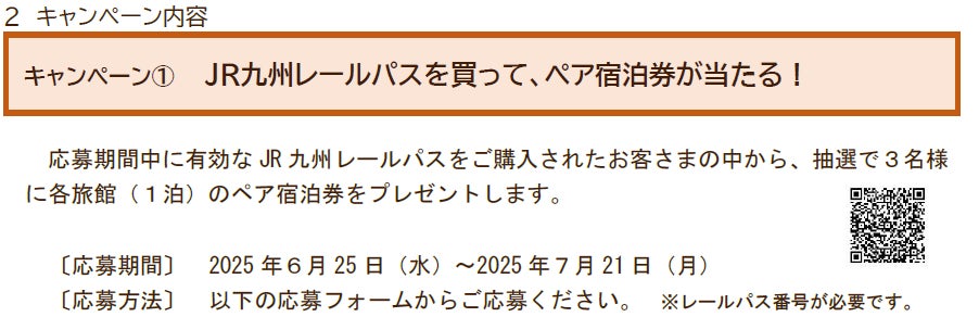この度、JR九州と3つの旅館が連携し、九州の鉄道の旅の魅力の一つとして、3つの旅館を知っていただき、ご体験していただくため、JR九州レールパスをご利用のお客さま向けにキャンペーンを実施します。皆さまのご利用を心よりお待ちしております。