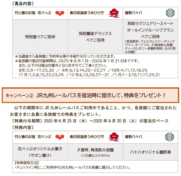 JR九州とJR九州グループ3つの旅館(竹と椿のお宿 花べっぷ、奥日田温泉うめひびき、嬉野八十八)では、JR九州レールパスをご利用される海外のお客さまを対象に、初めて共同販売促進キャンペーンを実施します