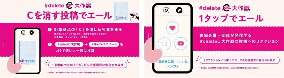 「#deleteC大作戦」は「あつまれ、想い」をスローガンに掲げ、期間中に、キャンパスノートの「Campus」ロゴの「C」の部分を自由なカタチで消した画像や動画を、「#deleteC大作戦」と「#キャンパスノート」をつけてSNSで投稿、もしくは「コクヨのぶんぐ」の公式X(旧Twitter)(@kokuyo_st)の該当投稿に対してリアクション(リツイートやいいね)・再生をすると、1投稿あたり100円が、1リアクション・再生あたり10円が、がん治療研究への寄付・啓発費用として、当社からdeleteCを通じて届けられます。