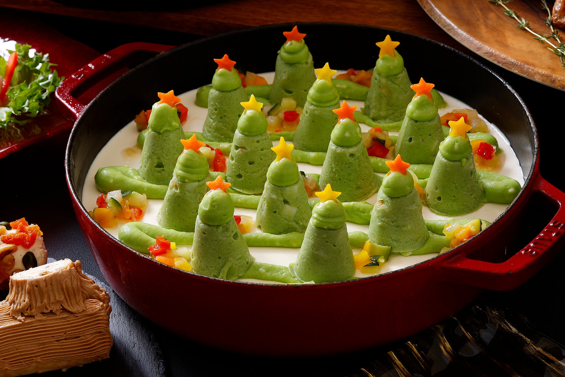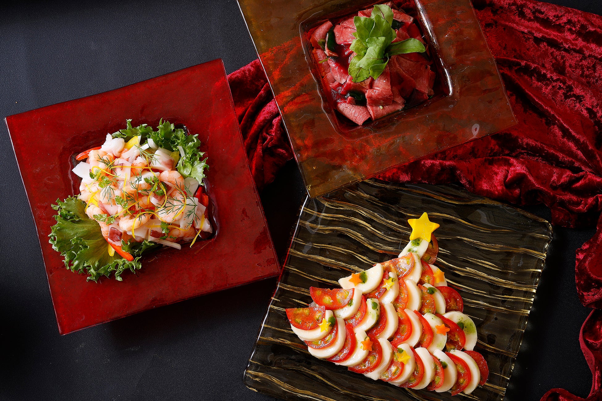 人気のサラダコーナーには、ビーツの赤とバジルの緑が鮮やかなクリスマスカラーのタブレサラダなど、カラフルなシェフ特製サラダを5種類ご用意。冷前菜は、クリスマスツリーに見立てたカプレーゼや、ナッツやドライフルーツ、エディブルフラワーで飾ったクリームチーズのルーローなど目を惹く華やかな料理が並びます。