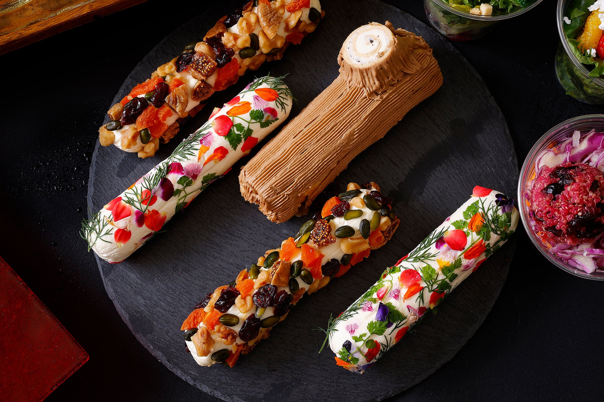 ・クリームチーズのルーロー エディブルフラワーとナッツ&ドライフルーツ
