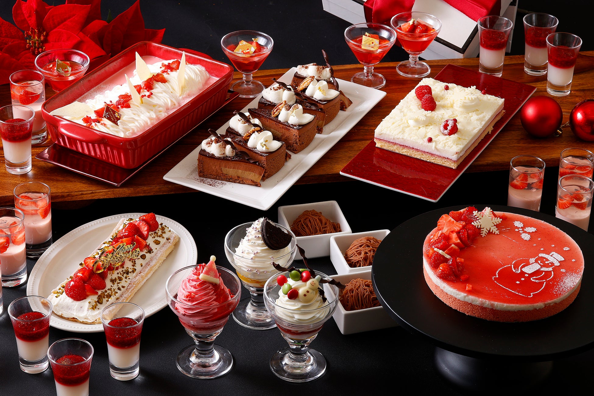 ・ガトー:フレッシュいちごを添えたラズベリームース、スノーマンとちおとめミルク、ウィンター カフェショコラ、ホワイトレアチーズ、いちごとピスタチオのパイ