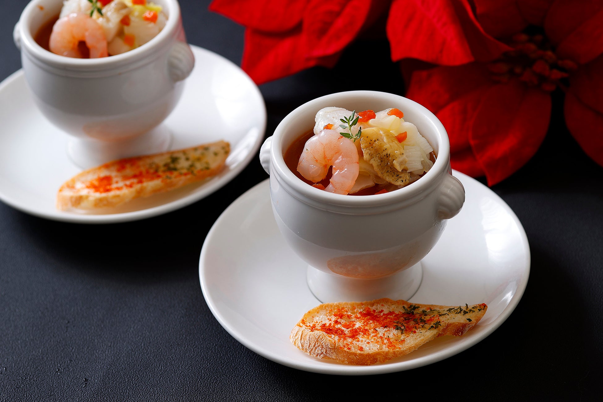ブッフェの始まりには、シェフからのおもてなしの一品として、シーフードと野菜を煮込んだブイヤベース風スープをサクサクのクルトンを添えてお席までお持ちいたします。
