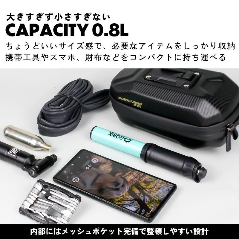 容量0.8L、重量205gの軽量サドルバッグで、スマホや空気入れ、チューブなどの