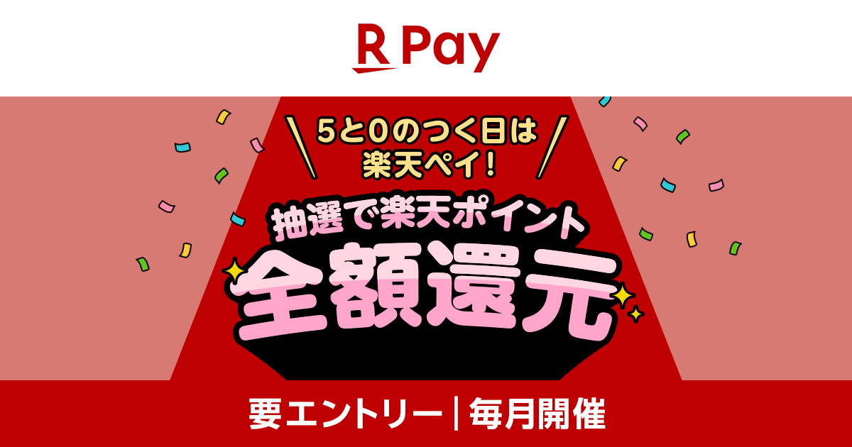 楽天ペイメント株式会社(以下「楽天ペイメント」)は、キャッシュレス決済サービス「楽天ペイ」において、「5と0のつく日は楽天ペイ!お支払いが全額還元のチャンス!」キャンペーンを、2025年12月1日(月)から2026年1月6日(火)まで(注1)実施することをお知らせします。