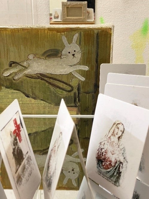 飯田は今年、フランスのアーティスト・イン・レジデンスに滞在。今回展示される新作のなかには、現地で目にした町の教会のマリア像や教会にいたうさぎの記憶なども感じられます。今年の干支であったうさぎと、クリスマスを連想しながらお楽しみいただける展示です。