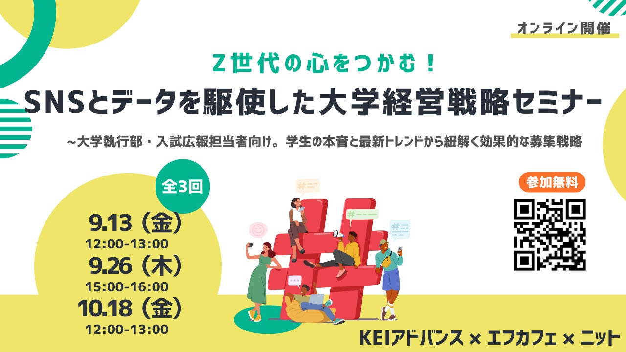 このたび、令和6年9月13日(金)12:00より、株式会社KEIアドバンス(本社:東京都千代田区、代表取締役:矢島敏男)、株式会社エフカフェ(本社:大阪府大阪市、代表取締役:江上周平)と共同で、大学の募集広報に特化した画期的なオンラインセミナーを開催いたします。効果的な募集広報戦略や、データに基づく入試動向、デジタルマーケティングの活用法など、実践的かつ包括的なノウハウをお届けします。