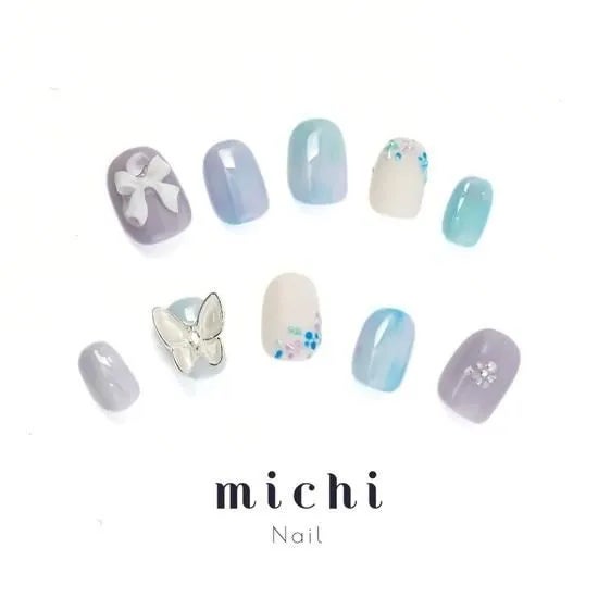 シェルアートは、まるであじさいの花びらのように繊細で透明感があり、指先に涼しげな季節感を演出。