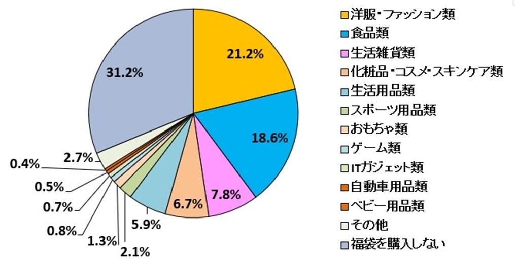 購入したい福袋のジャンルで第1位は「洋服・ファッション類」で総回答数の21.2%。「食品類」(18.6%)、「生活雑貨類」(7.8%)がこれに続いています。