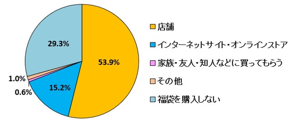 実際に購入する方法は「店舗」が53.9%で、他を引き離しています。福袋というイメージが行動に反映されているかもしれませんね。