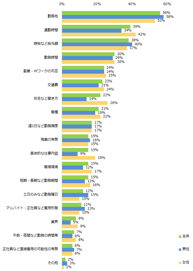 「ある」「どちらかと言えばある」と回答した方に、5類移行後に新しく”追加した条件”や”内容を見直した条件”について伺うと、トップ3は「勤務地」(56%)、「通勤時間」(39%)、「時給など給与額」(38%)でした。第1位は男女ともに「勤務地」だったものの、第2位以降は男女別で異なる結果に。男性のほうが「時給など給与額」を、女性のほうが「通勤時間」に関する条件で変化があったことが分かります。