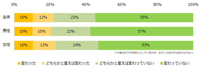 新型コロナウイルス流行前と後で、選ぶバイトに変化があったか伺うと、22%が「変わった」(変わった:10%、どちらかと言えば変わった:12%)と回答しました。