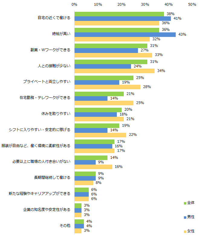 「変わった」「どちらかと言えば変わった」と回答した方に、どのようなバイトを選ぶようになったか伺うと、トップ3は「自宅の近くで働ける」(38%)、「時給が高い」(36%)、「副業・Wワークができる」「人との接触が少ない」(同率31%)でした。男女別でみると、男性と女性で差がある項目もいくつか見受けられました。バイト選びの変化についての具体的なコメントも紹介します。