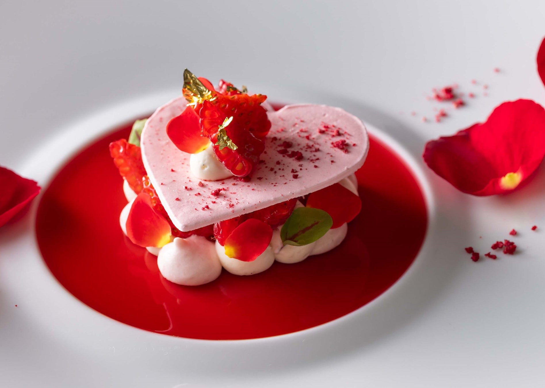 説明:メレンゲで象った大きなハートが印象的な一皿。ハートにはニナスの紅茶を練りこんだサブレ、フランボワーズのジュレにはバラの香りを閉じ込めました。様々な食感と香りが口いっぱいに広がる至福の時をお楽しください。