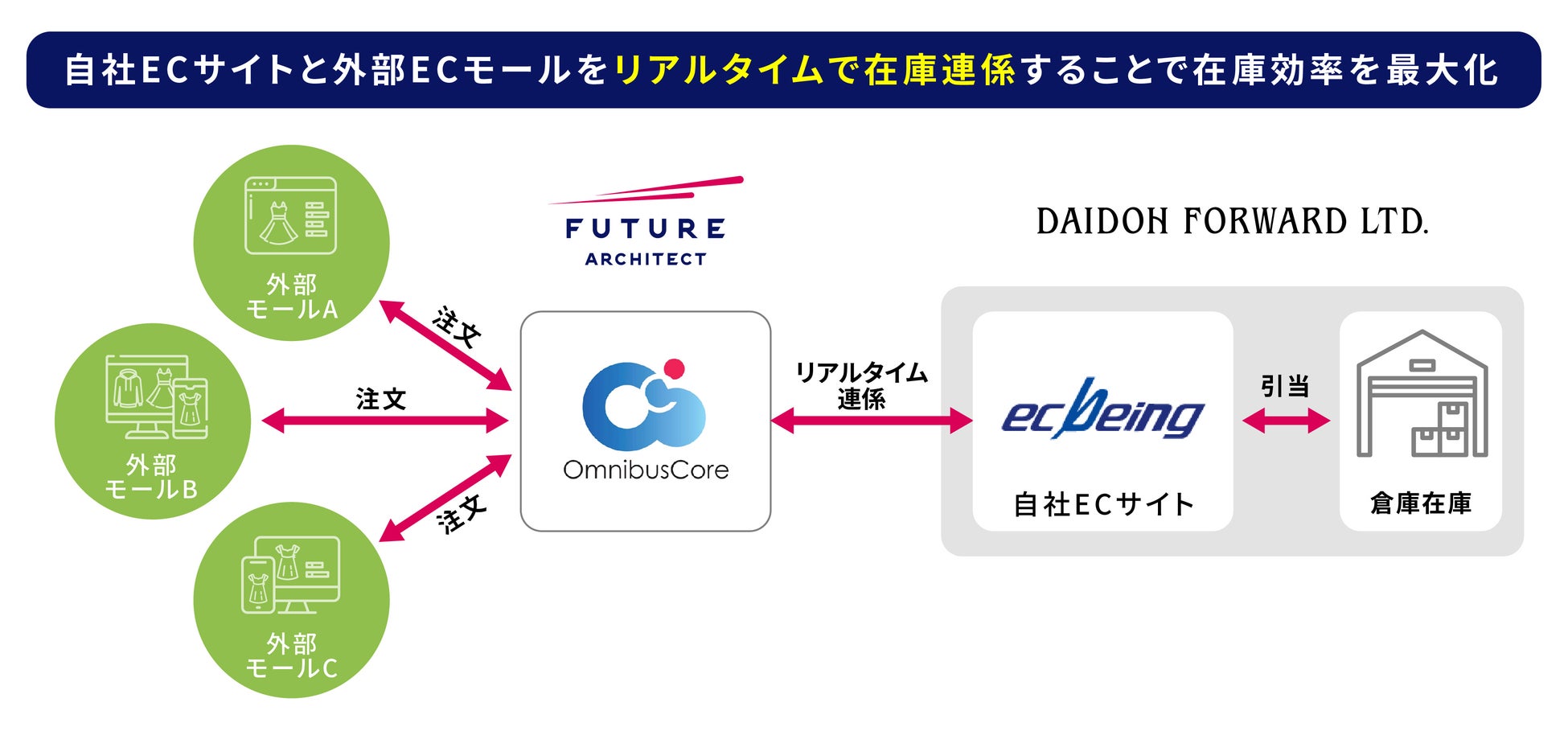 これまでフューチャーアーキテクトは20以上のECサイトと約30のメーカーに対してOmnibusCoreでのデータ自動連係スキームを提供してきましたが、今回はダイドーフォワードが自社ECサイトに採用している中堅・大手企業向けECプラットフォームシステム「ecbeing」(※2)と外部ECモールとのシームレスなデータ連係を実現しました。外部ECモールからの引き当てをOmnibusCoreからecbeingにリアルタイムで連係することで、在庫効率化を可能にします。ダイドーフォワードではOmnibusCoreを活用して2024年6月時点で2つの外部ECモールと連係し、年内に9つまで外部ECモールとの連係を拡大する予定です。