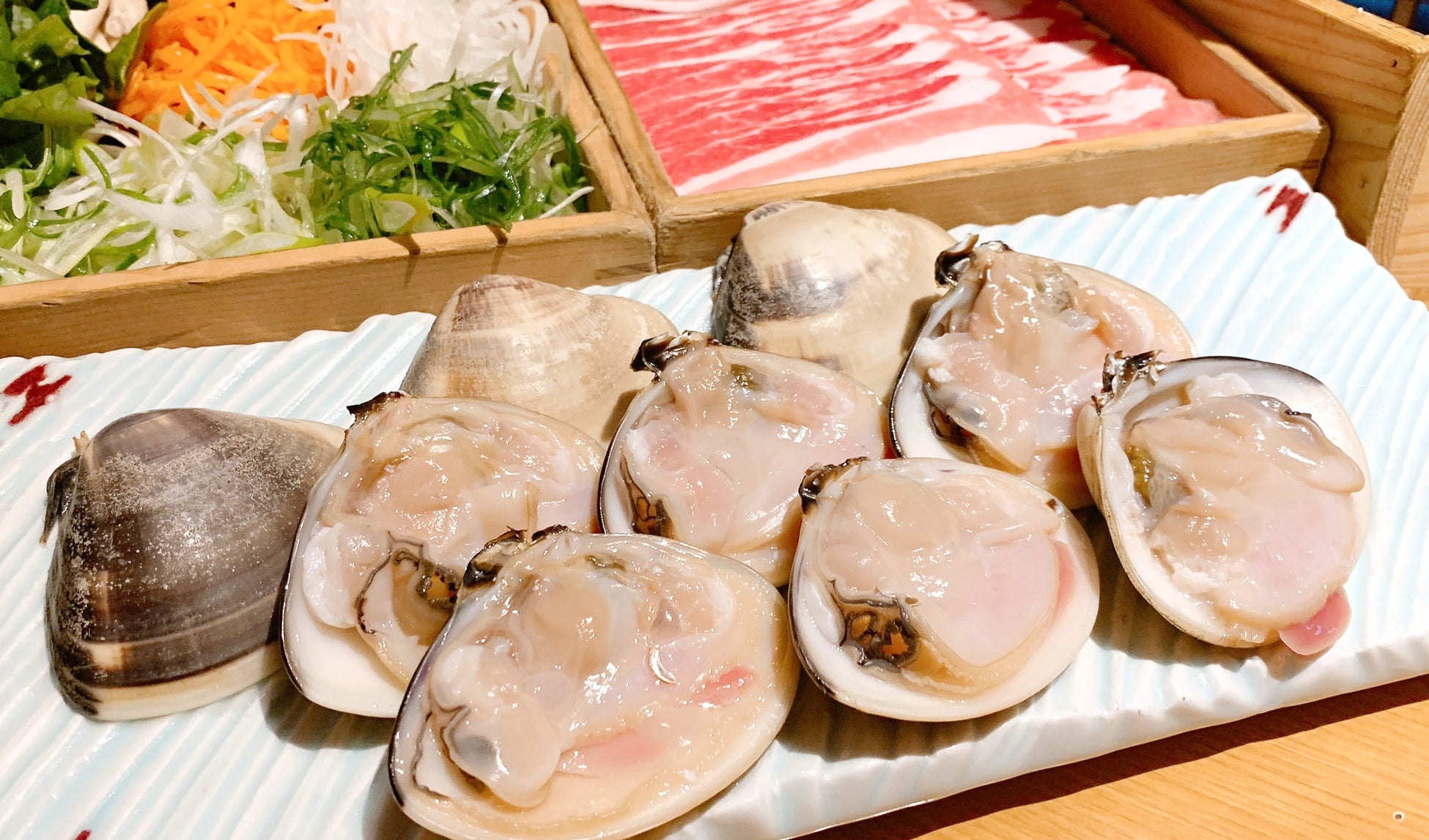 内 容: 一人前 大はまぐり3個、豚⾁、お野菜、お出汁