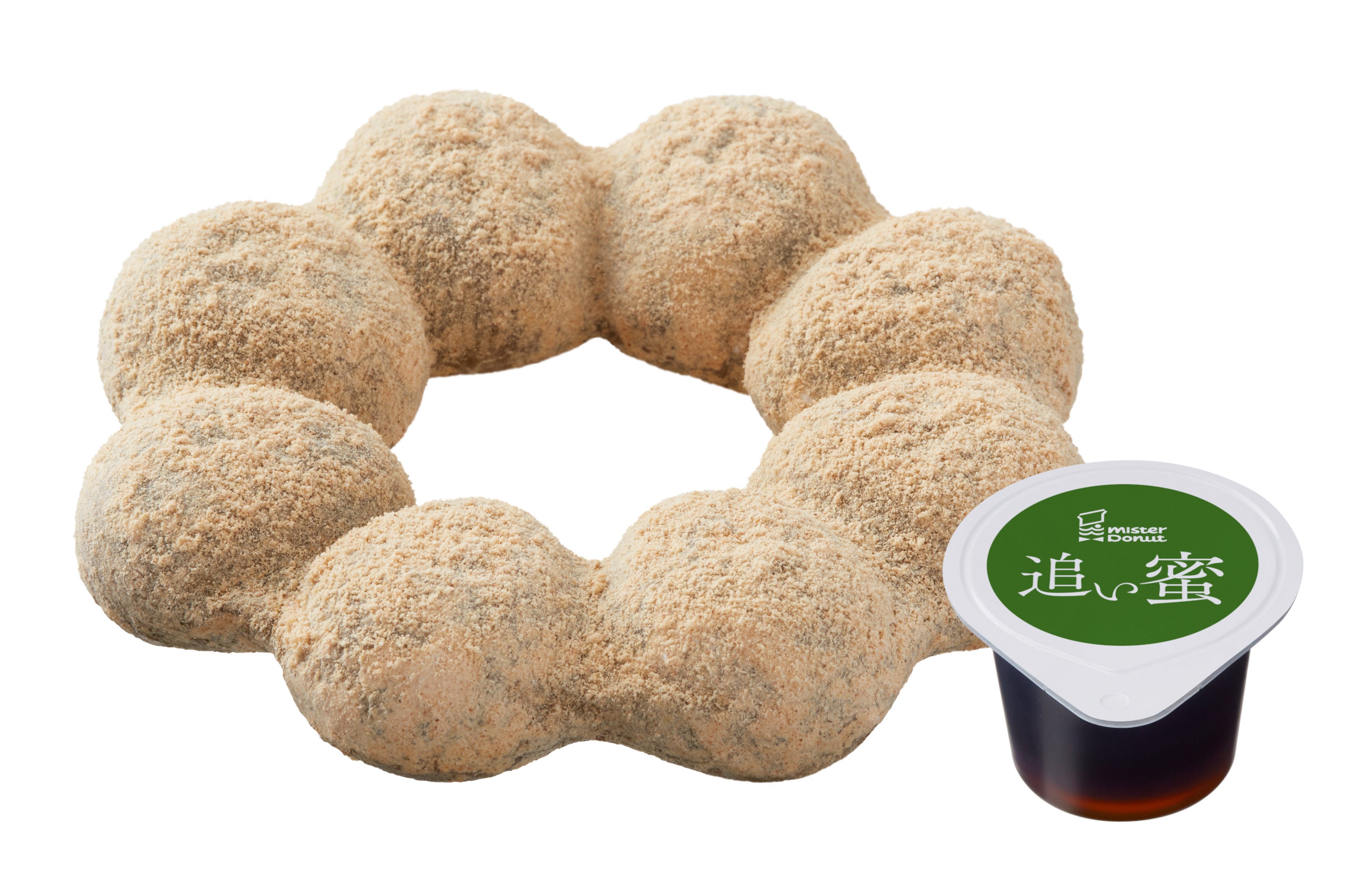 やわもっちり食感の「ポン・デ・リング 生」に祇園辻利の宇治抹茶を練り込み、きなこをまぶしました。黒みつを”追い蜜”して、味の変化を楽しめます。