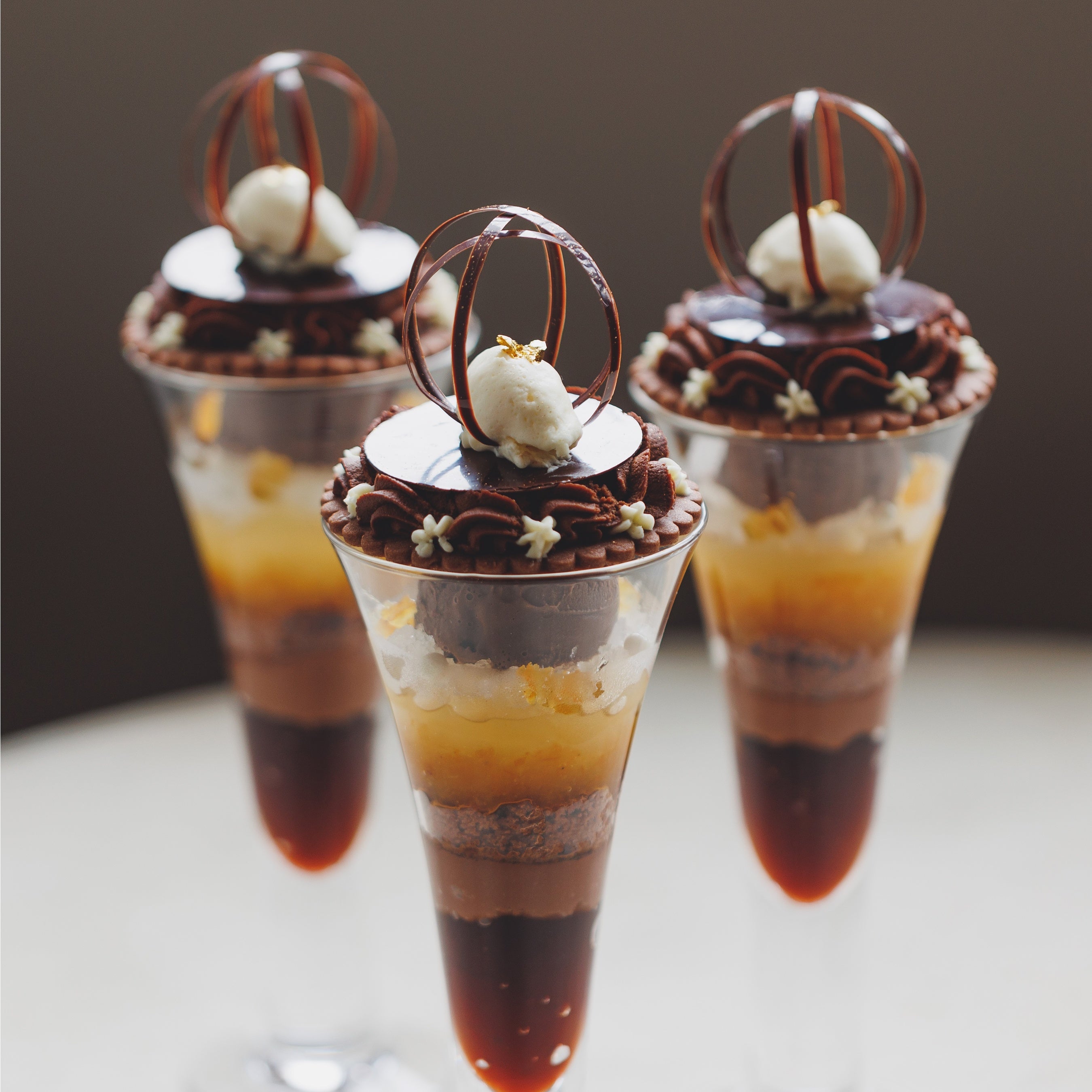 オペラのケーキをイメージし、柚子の酸味をアクセントに加えたチョコレートパフェ。柚子と生姜のソースや、まろやかな苦味の水出しコーヒーのジュレなどを合わせて、濃厚なチョコとのハーモニーをお楽しみいただけます。