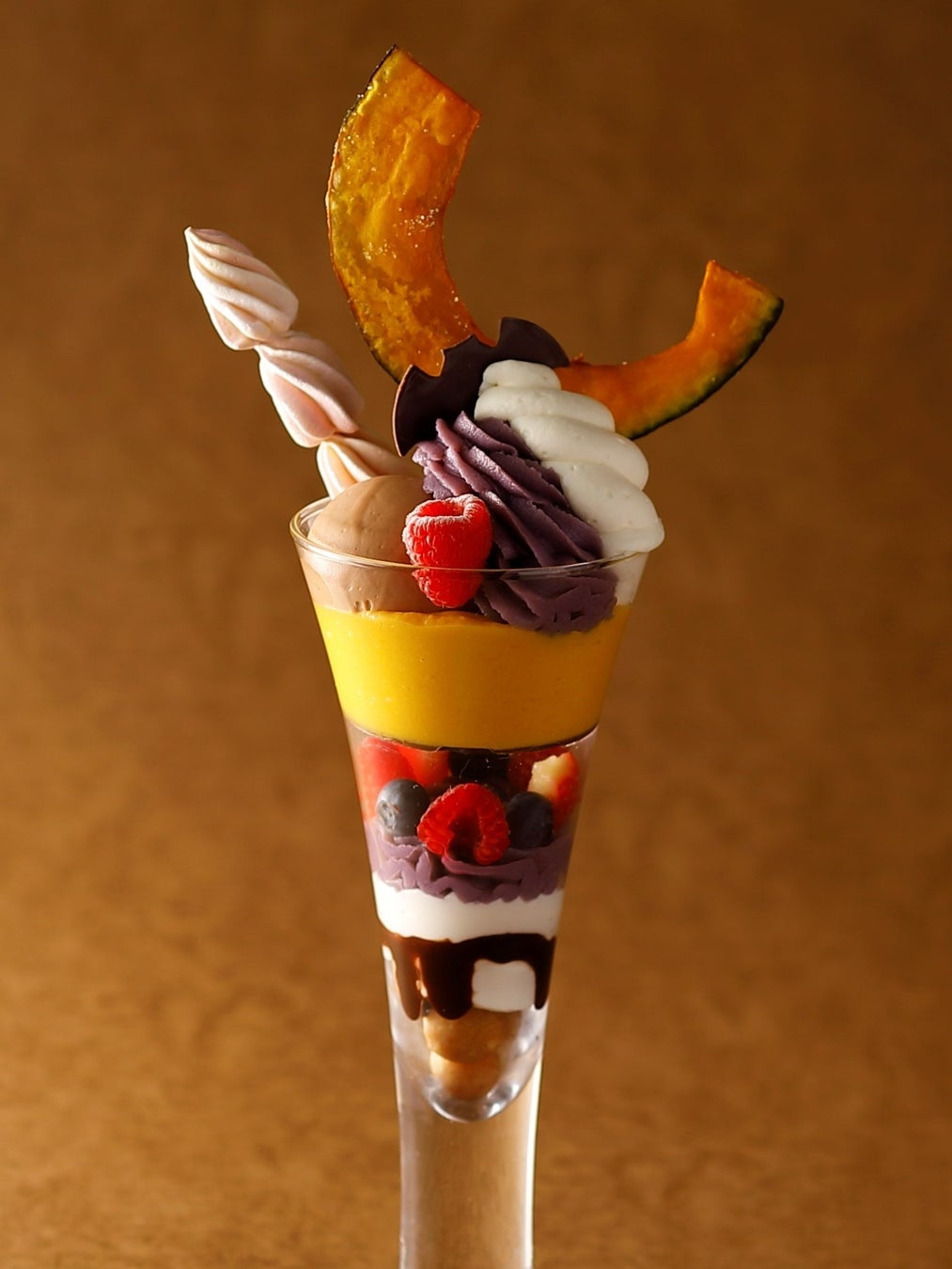 やさしい甘味のかぼちゃクリームにシナモン香るジェラートと紫芋のソルベを合わせました。コーヒーやチョコレートの苦味がアクセントになった少し大人の味わいです。ザ・ハラジュクオリジナルのハロウィンパフェをご賞味ください。