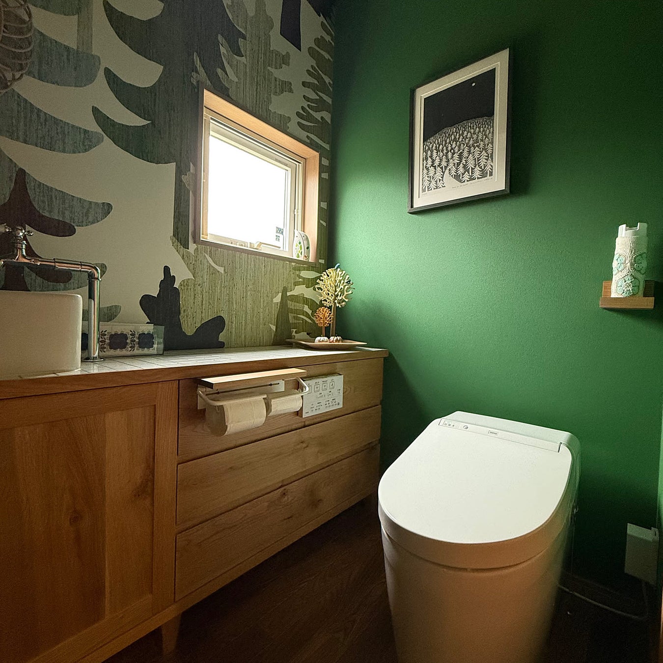 トイレ空間というより、窓から差し込む光もあり、森の中にいるようなグリーンの壁紙も印象的で、ワクワク想像力が膨らみそうな”お部屋”のような空間です。トイレに入るのも楽しくなりそうです