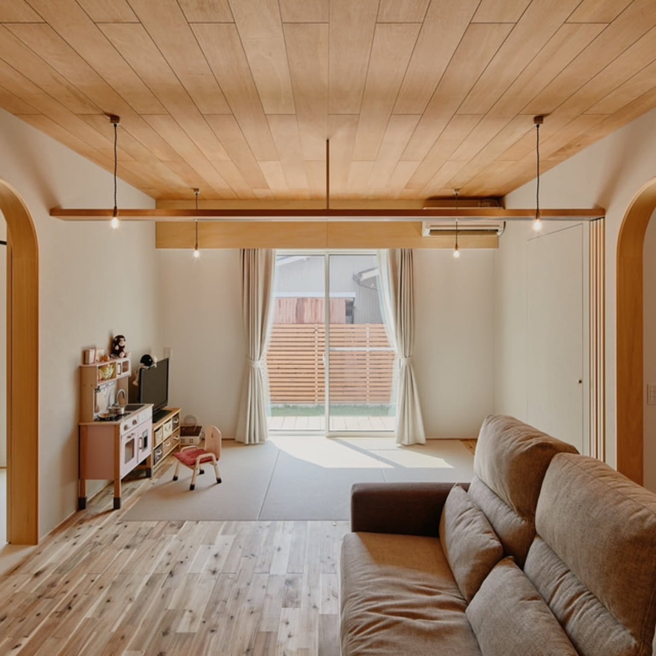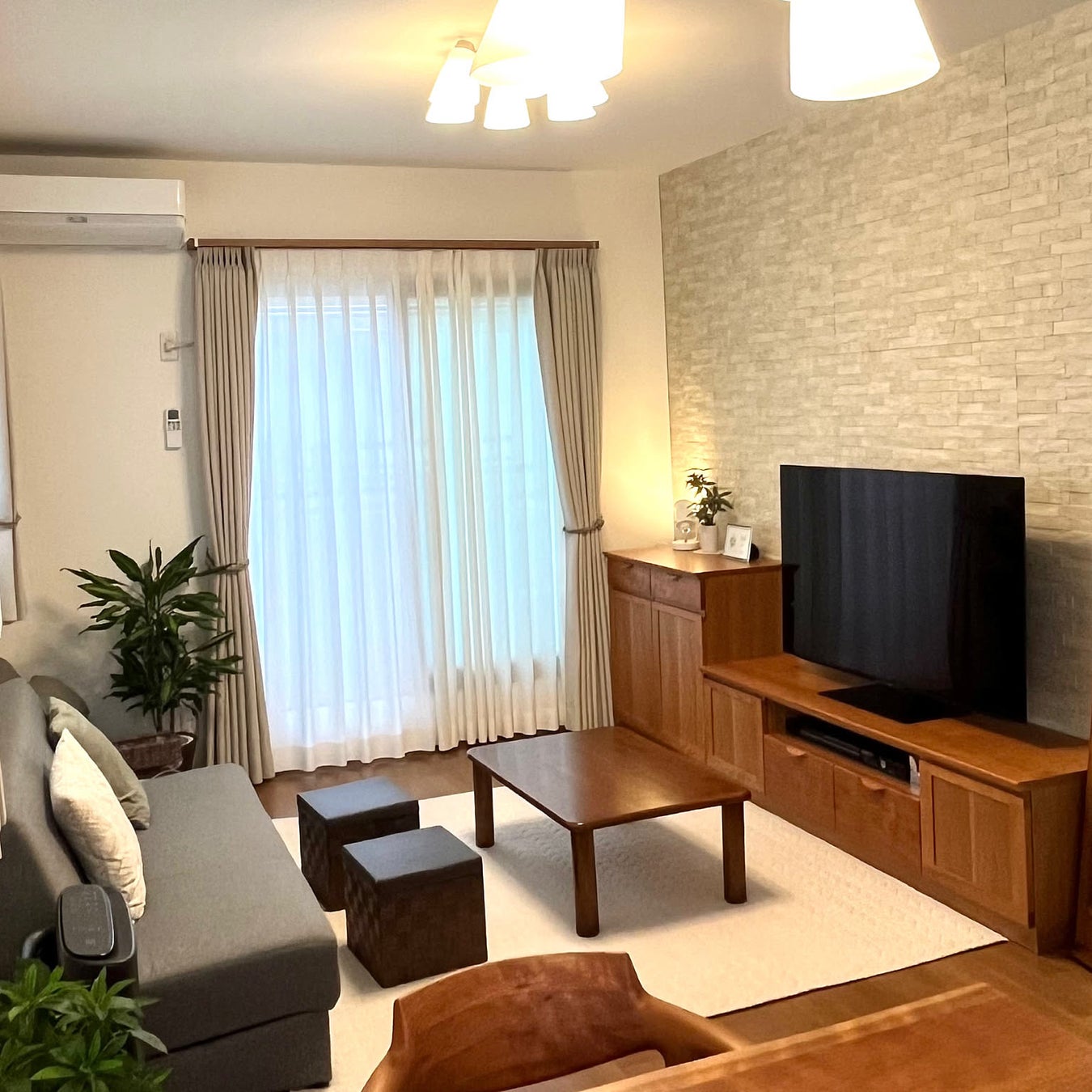 DAIKENの和紙畳の灰桜色とナチュラルな床材が見事に調和し、家具の色合いともぴったりマッチしています。空間全体に統一感が生まれ、家族がリラックスし、団らんするのに素敵なスペースです。
