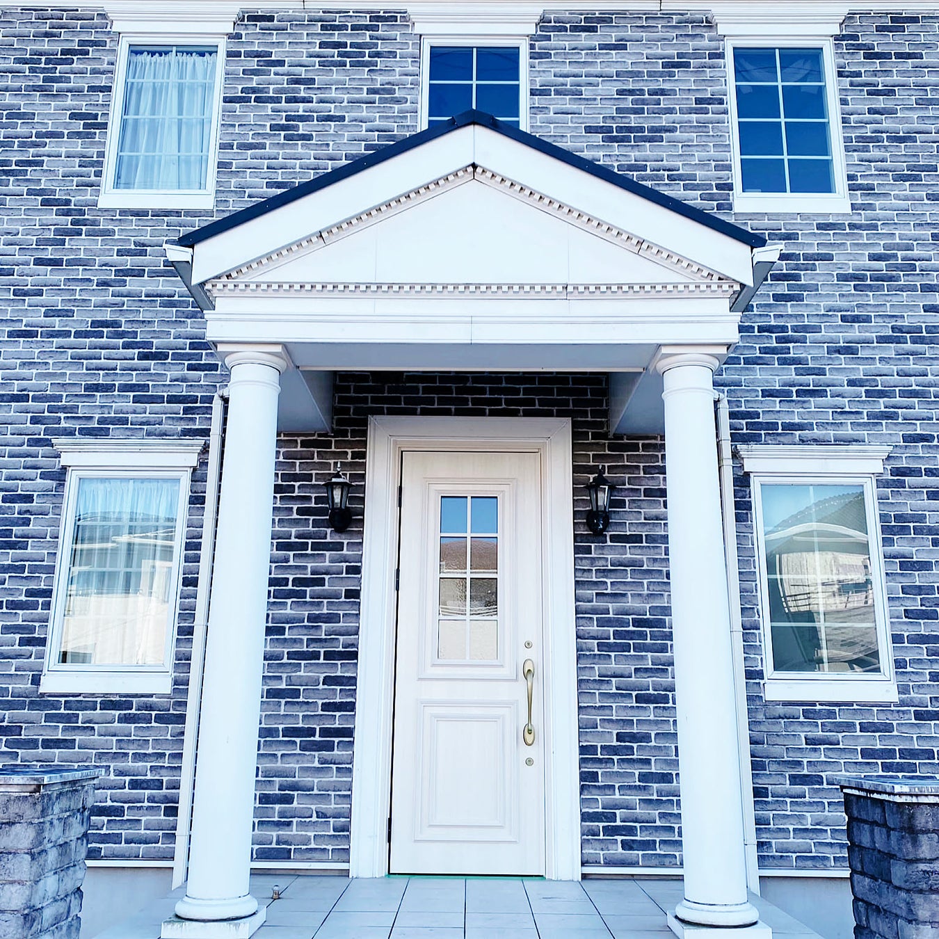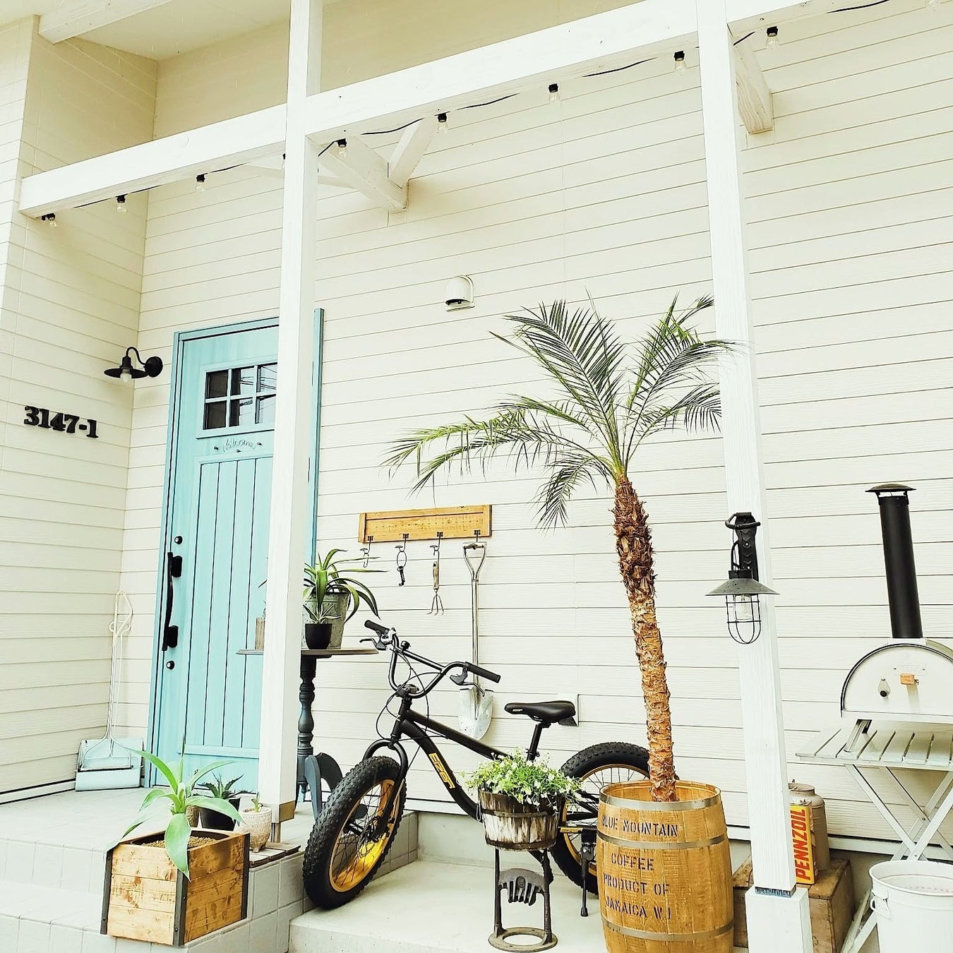 白を基調としたアイボリーの外壁に、アイスブルーノーチェの玄関ドアが差し色となり、素敵です。西海岸スタイルを引き立てるヤシの木やグリーン、こだわりを感じる自転車や小物アイテムが調和し、心躍るような、訪れるたびにワクワクする玄関空間が広がっています。