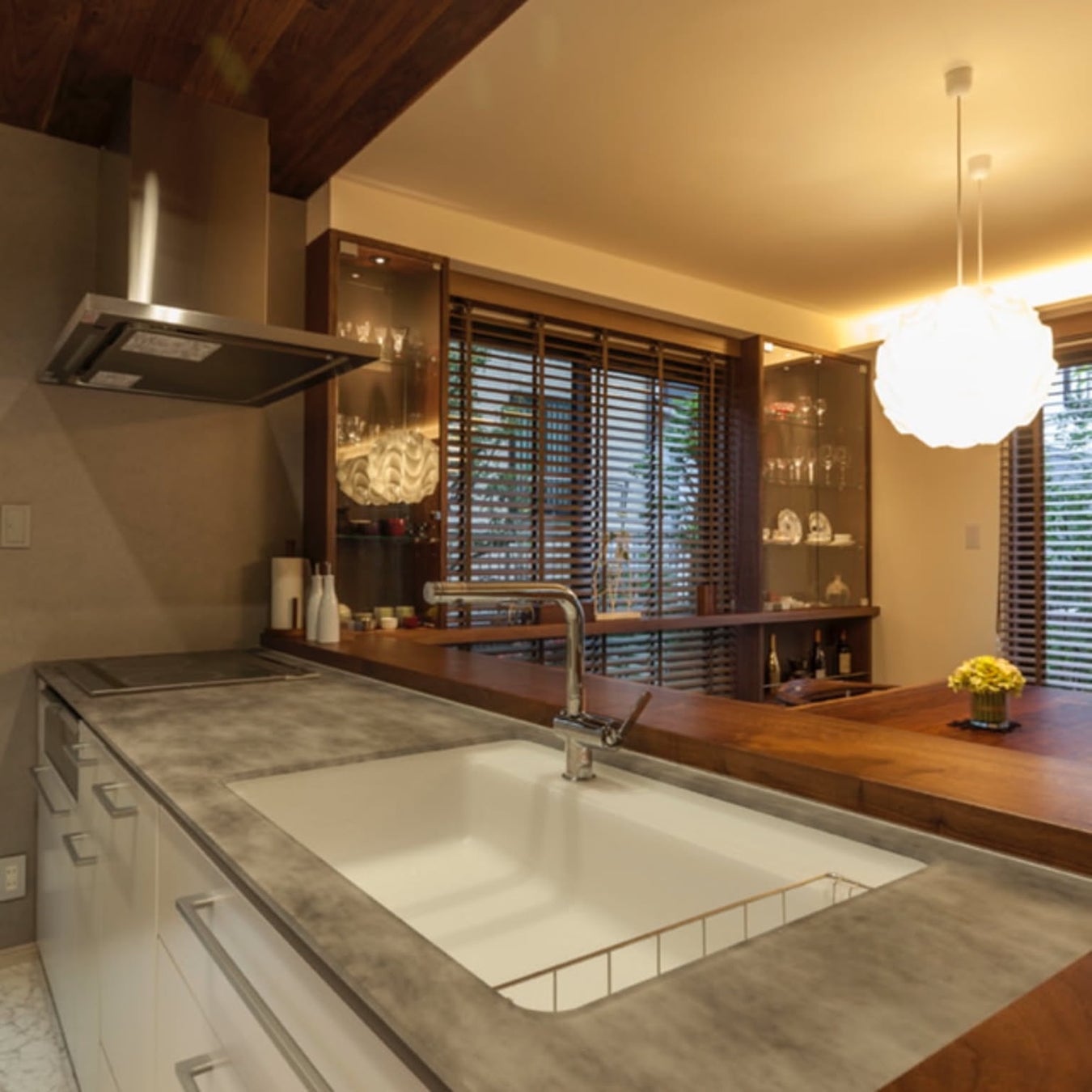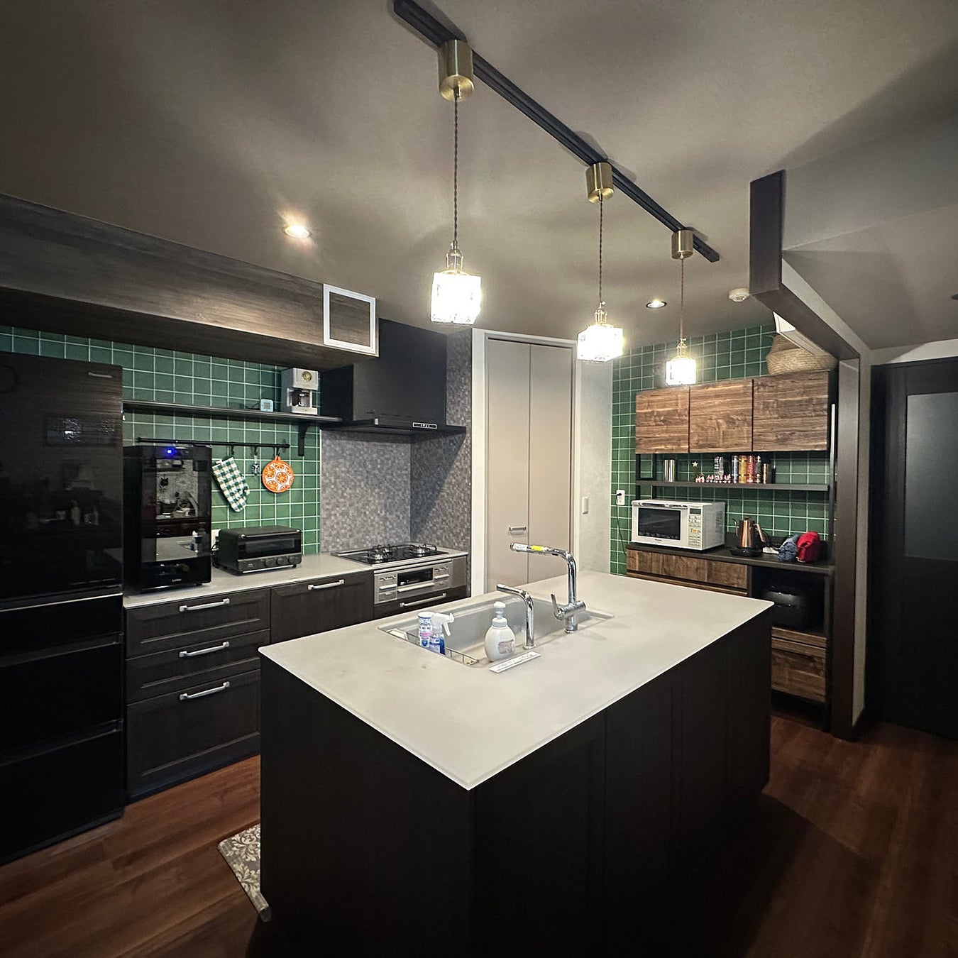 シックな木目調の床とキャビネットに壁面のグリーンのタイルが映えて、印象的な空間です。シンボリックなシンク側のカウンターは、開放感があり作業もしやすそうで、みんなで囲みたくなるキッチンです。