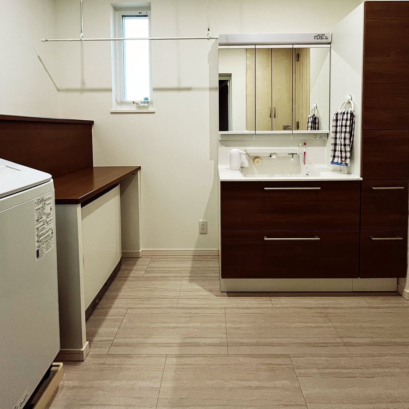 窓もあり、ひろびろと使いやすそうなランドリールーム。TOTOの洗面化粧台と作業台カウンターをお気に入りのカラーでコーディネートして、洗濯など忙しい家事も気持ちよくこなしているgudemanaさんの様子が伺えます。