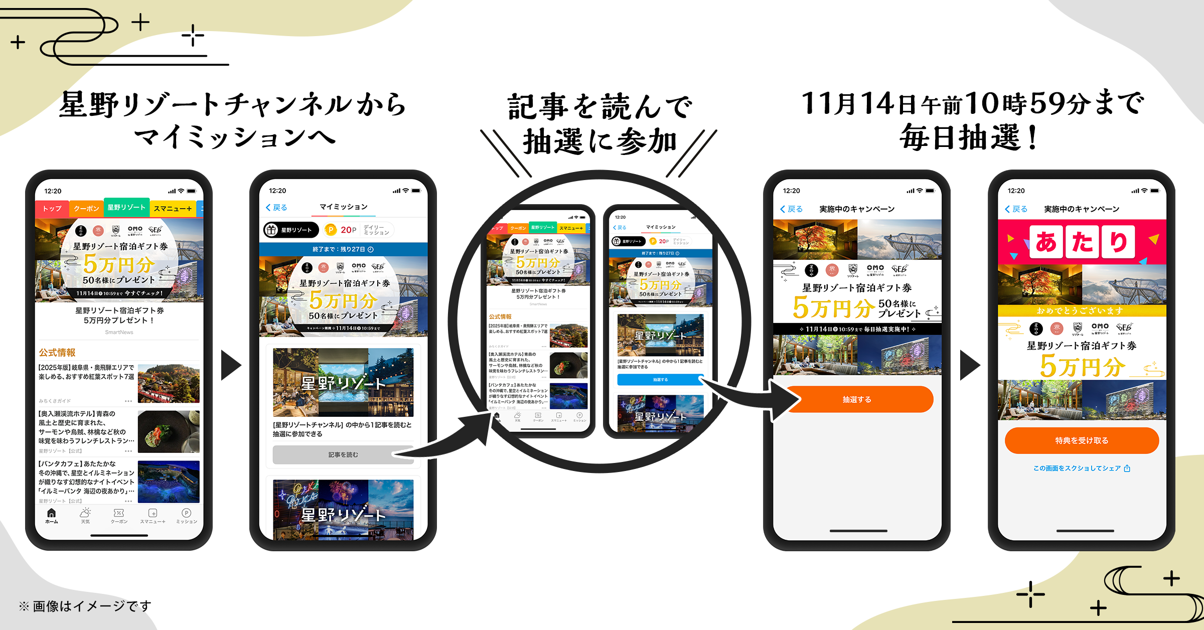 1.1日1回「星野リゾートチャンネル」で記事を読むと、1回抽選に参加できます。