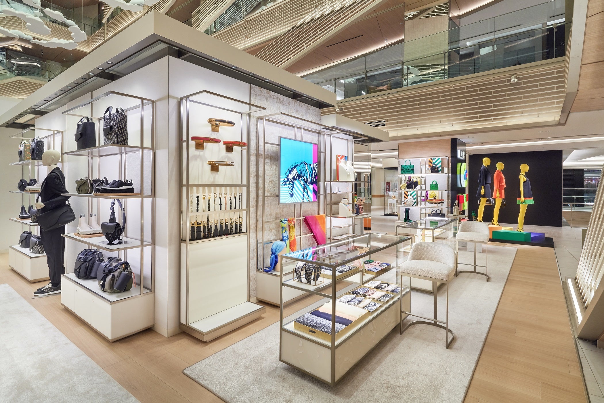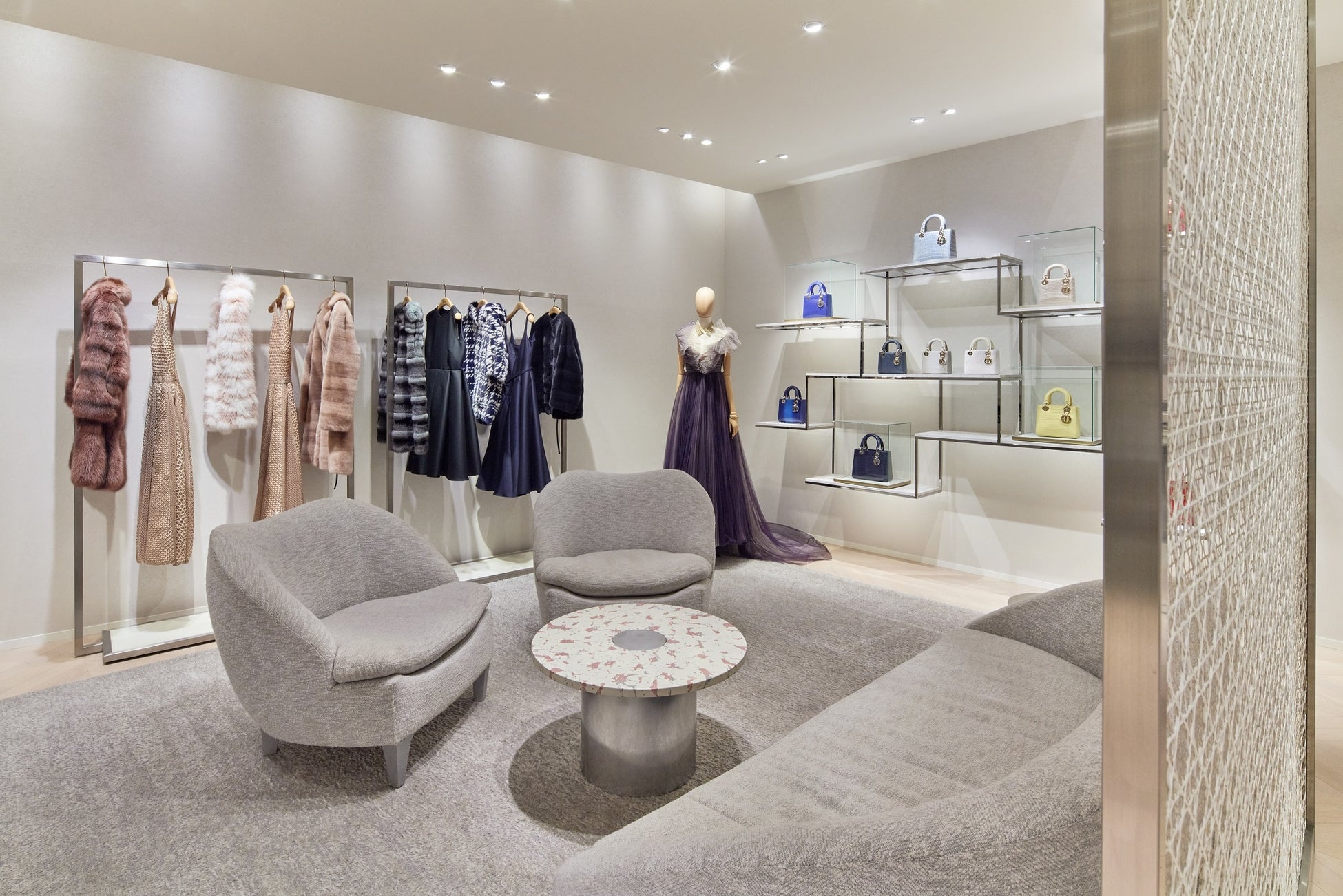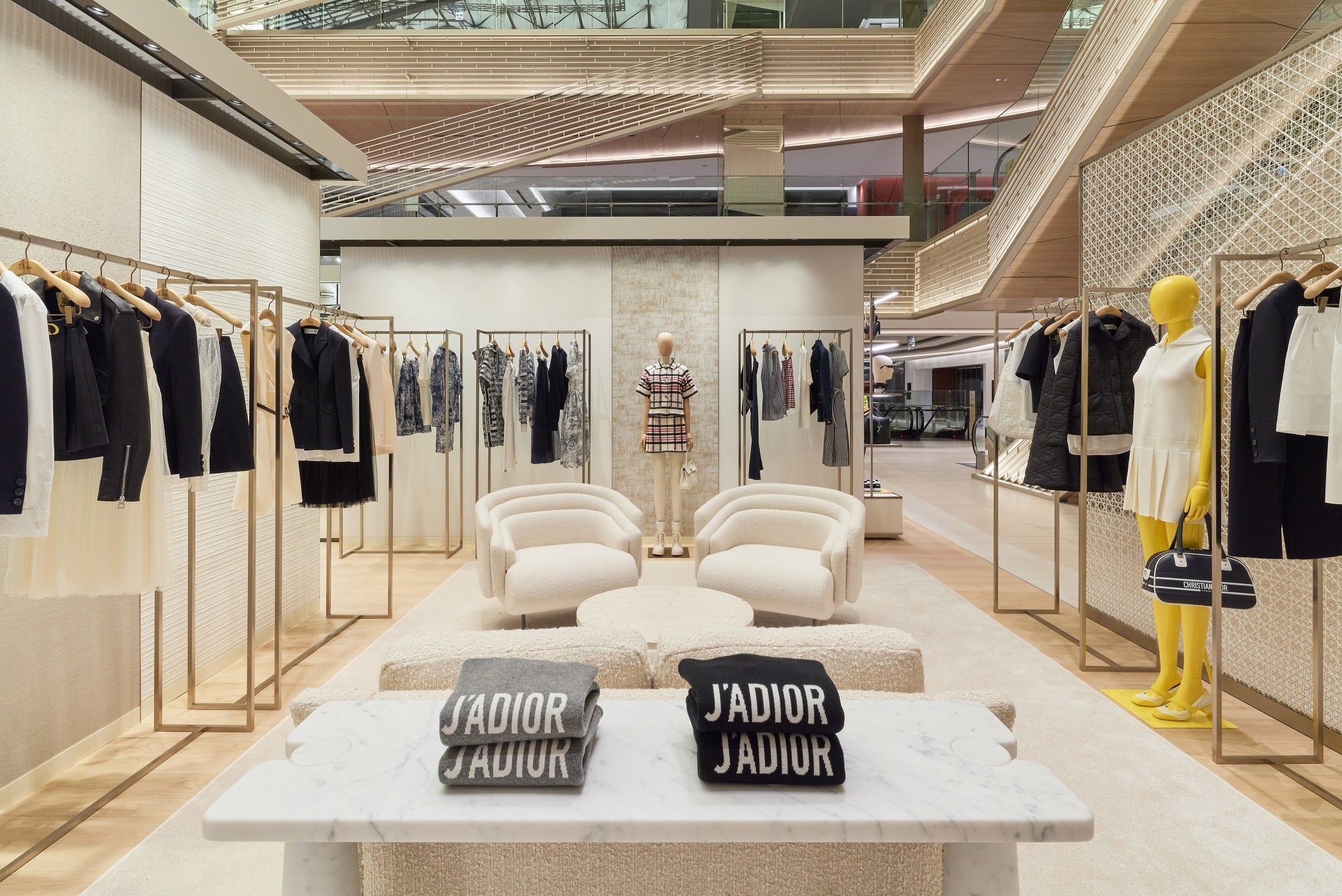 吹き抜け部分に位置するブティックを上階から見下ろすと、卓越したオートクチュールのクリエイションによるドレスや「バー」ジャケットを纏ったトワルが美しく並ぶ立体的なビジュアルが目を惹き、ブティックの中心には大型のロゴが象徴的にそびえ立ちます。