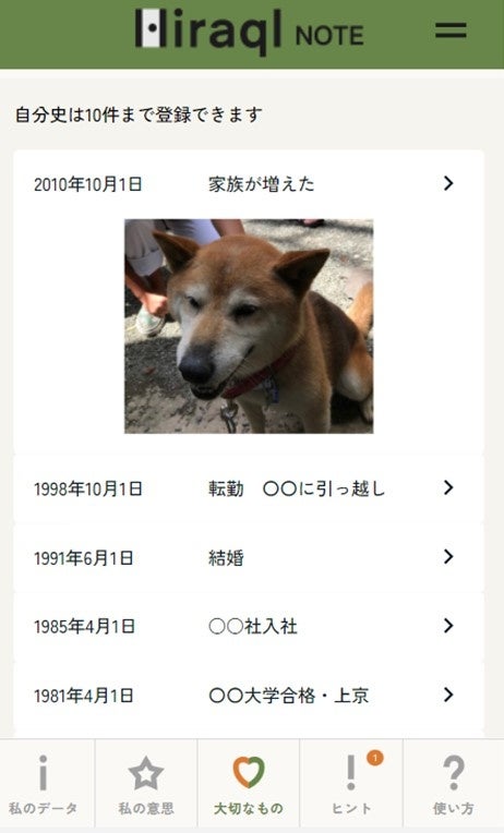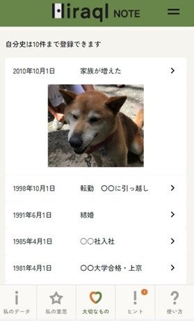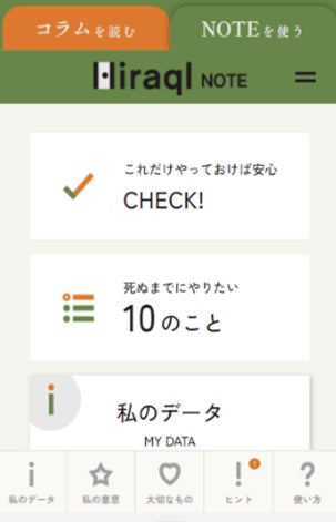 自分のデータや意思を整理し、記していくためのオンラインノートです。人生でやりたいことの具体的なプランを立てたり、ヒントコラムやイベントを通じて感じたことを生活に持ち帰り、記録していくことができます。