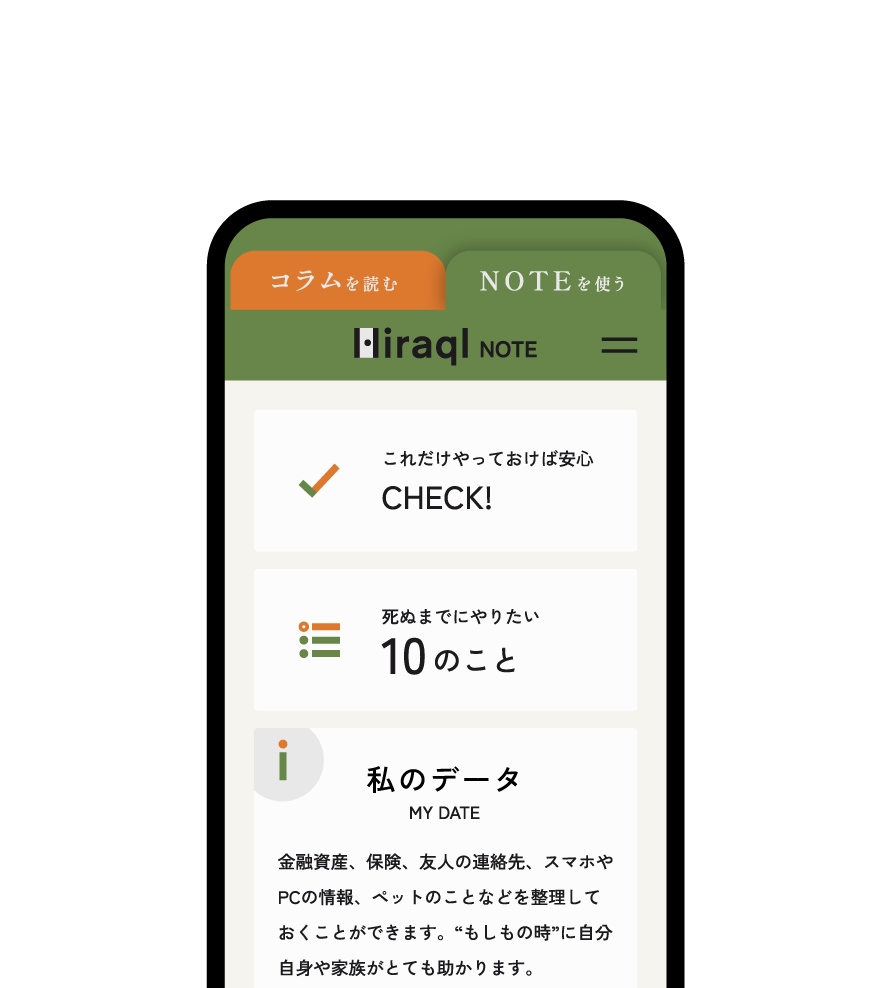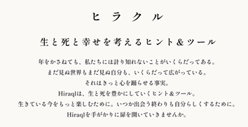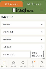 サービス名の「Hiraql(ヒラクル)」は、「ひらく」と「miracle」を合わせた造語で、人々が人生の新たなドアを開くことを後押しし、心豊かな日々を過ごすきっかけとなるイメージを表しています。本サービスは、利用者が歳を重ねることに向き合い、これからの人生を前向きに設計し万全の備えができるよう、必要になるさまざまなサービスをワンストップで提供することを目指しています。気づきや学びのきっかけとなる「ヒントコラム」と、その気づきを日常化・習慣化するオンラインノート「Hiraql NOTE」の2つの機能があります。