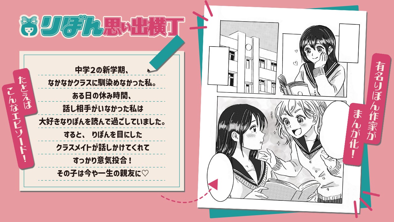 集英社の少女向けまんが誌「りぼん」は、オフィシャルファンコミュニティ「りぼんむすび」にて、「りぼん」創刊70周年記念特別企画『りぼん思い出横丁』を実施中です。あらゆる年代の「りぼん」読者からまんが誌「りぼん」や「りぼん」作品にまつわる思い出エピソードを募り、人気作家がショートストーリーとしてまんが化するスぺシャル企画で、年間を通して複数回の実施が決定しています。