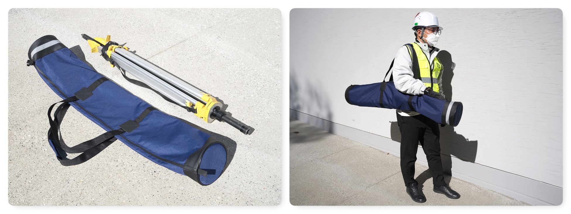 DJI D-RTK2 モバイルステーションのポールと三脚が収納できるセキドオリジナルのソフトバッグです。ハードケースよりも軽量で収納しやすく、持ち運びやすことが特徴です。夜間の持ち運びを考慮した反射材を備え、耐久性を考慮した素材・厚みで作られています。機材が大きく重くなりがちな D-RTK2 モバイルステーションを使った業務の際に、少しでも手軽な運搬ができることをお求めた製品です。