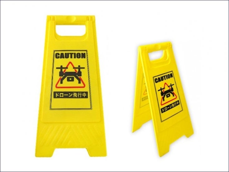 ドローン飛行中である事を警告する専用サインボードです。ドローンを強調したデザインにより、周囲に強く注意喚起します。