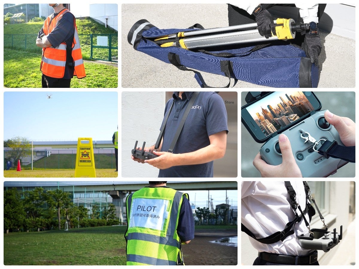 様々な現行DJIドローンの送信機に対応し落下防止と重量の軽減によりフライトに集中でき安全性を高めるストラップや、ドローンによる測量や運搬などで使われる DJI D-RTK 2 モバイルステーションのポールと三脚が収納できる軽量で耐久性に優れたソフトバッグ、ドローンフライトなどの業務中であることを周囲に知らせるメッシュベストなどを販売しています。