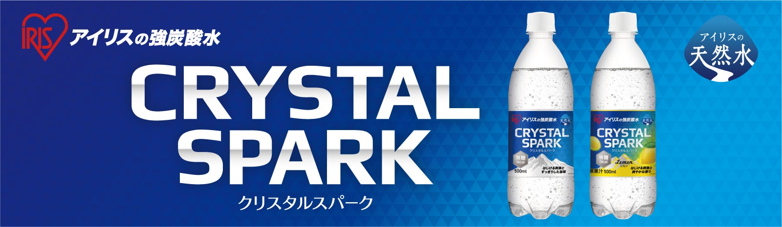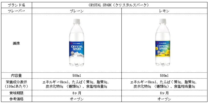 「CRYSTAL SPARK(クリスタルスパーク)」は、水のきらめきや輝き、爽快に弾ける炭酸の爽やかさ、毎日の暮らしに煌めきを添えたいといった想いを込めてネーミングしています。「クリスタルスパーク(プレーン)」は、心地よい刺激と爽快感、「クリスタルスパーク(レモン)」は、はじける刺激と爽やかなレモンの香りが特長です。(無果汁)