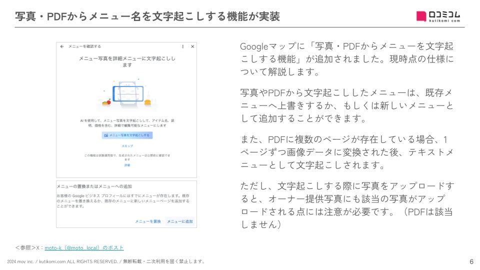 業界最大級のインバウンドビジネスメディア「訪日ラボ」及び 店舗向け集客一元化プラットフォーム「口コミコム」を運営する株式会社mov(代表取締役:渡邊 誠、本社:東京都渋谷区、以下mov)は、Googleマップ・Googleビジネスプロフィール(旧Googleマイビジネス)の更新情報や、口コミマーケティングノウハウなどの最新ニュースをまとめた「Googleマップ・MEOまとめ【2024年11月版】」を公開しました。