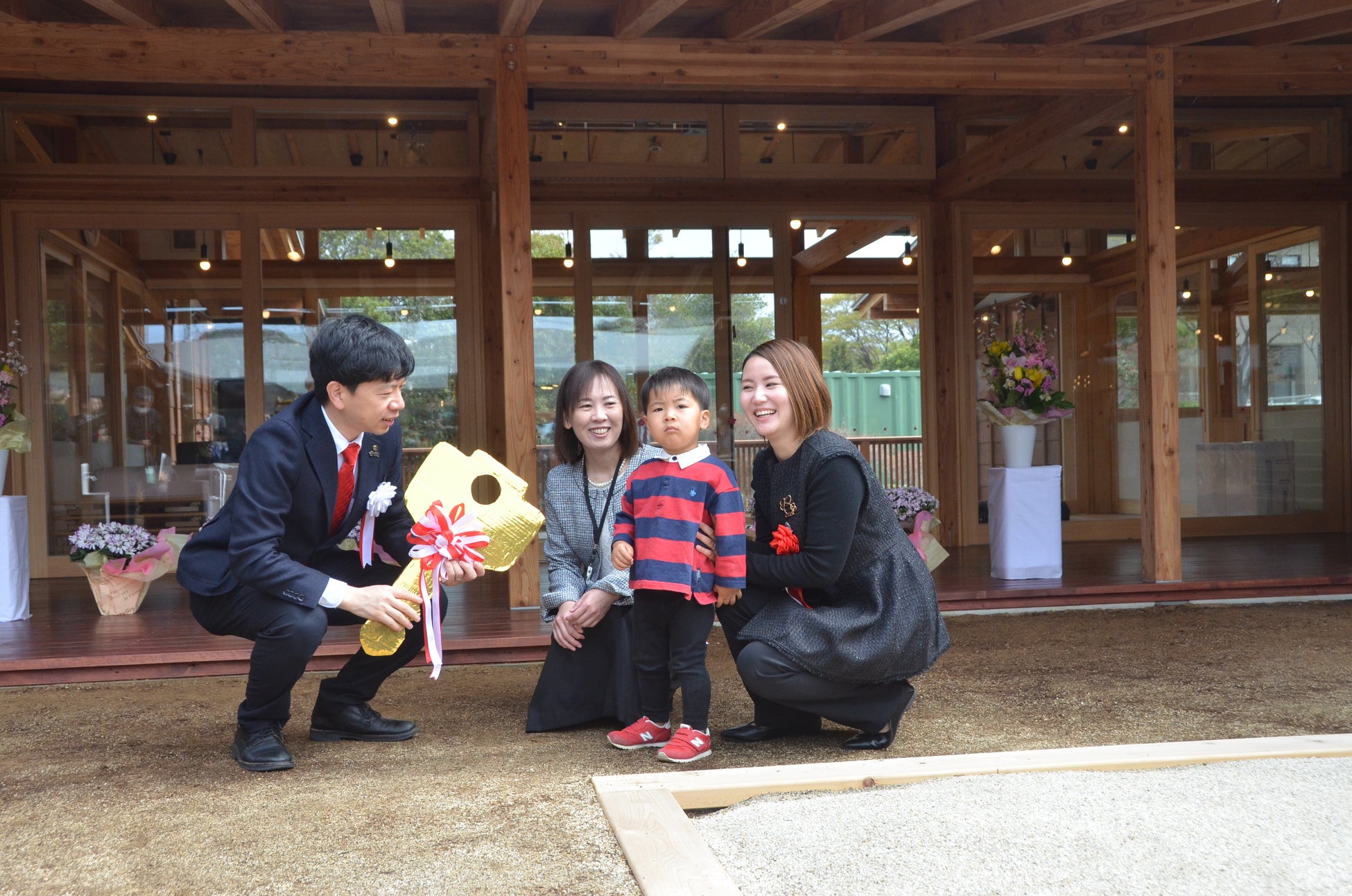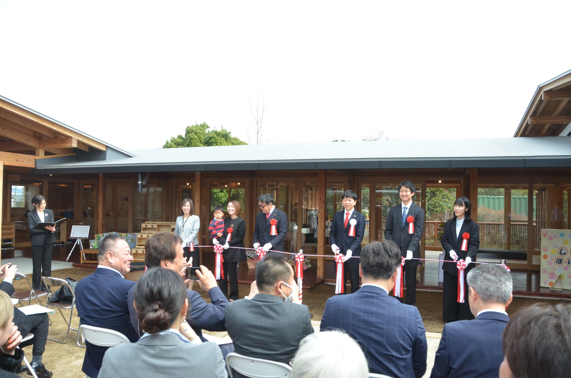 開園式は4月2日(水)、市や園などの関係者が出席して中庭で開かれ、長坂尚登市長や髙田洋子園長、園児の代表らがテープカットし、開園を祝いました。