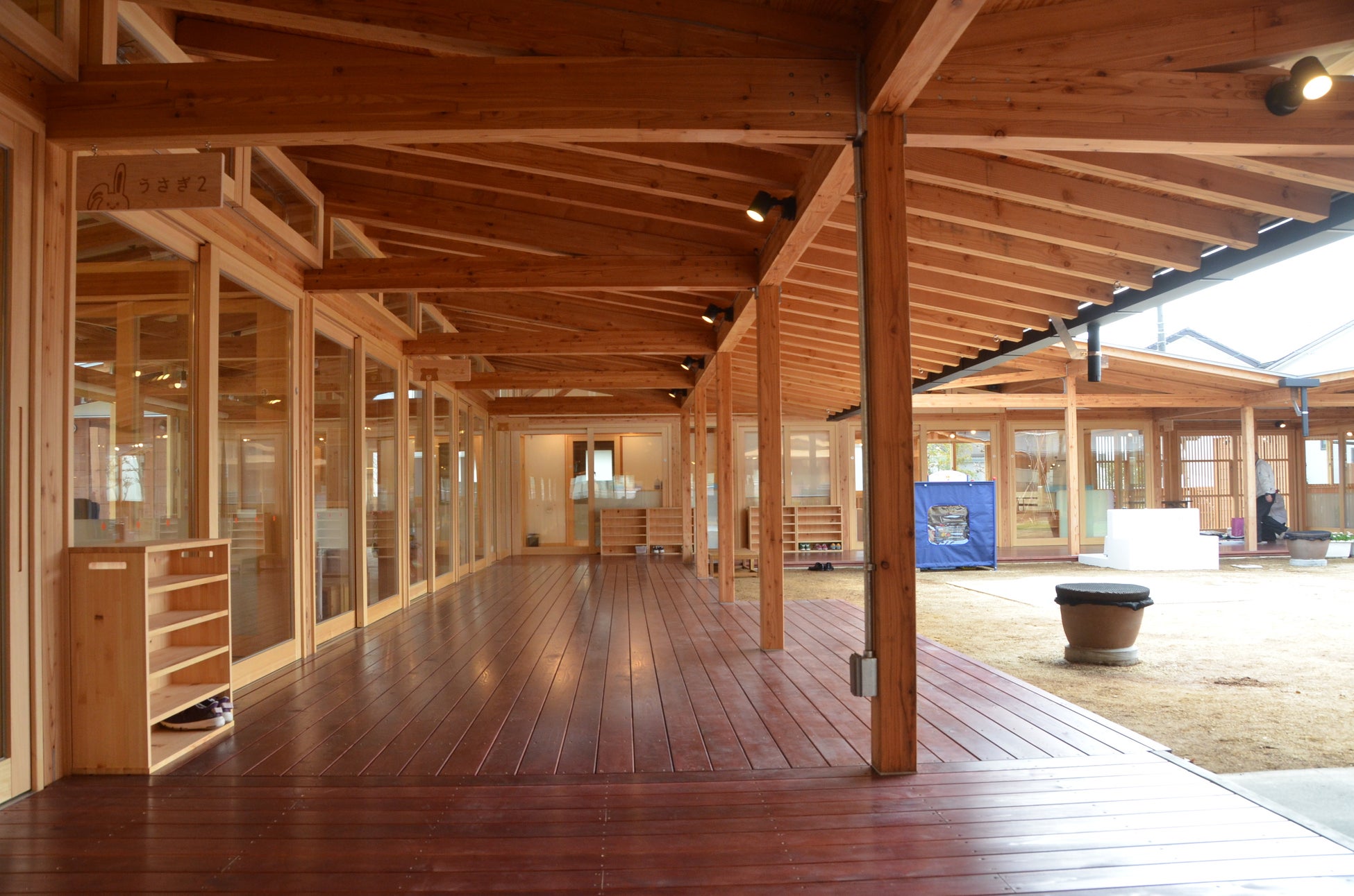 2023年12月に着工し、完成した園舎は木造2階建て延べ907平方メートルで、中庭「みんなのニワ」をぐるっと囲むように縁側「さんぽミチ」を配置しました。この縁側は、長い軒の出を活用した半屋外空間で、長い軒の出は日差しや雨を遮ります。