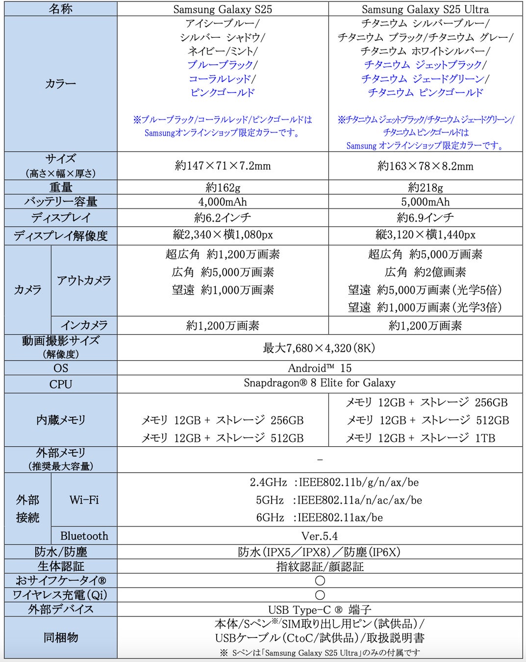 <主な仕様:「Samsung Galaxy S25」、「Samsung Galaxy S25 Ultra」>