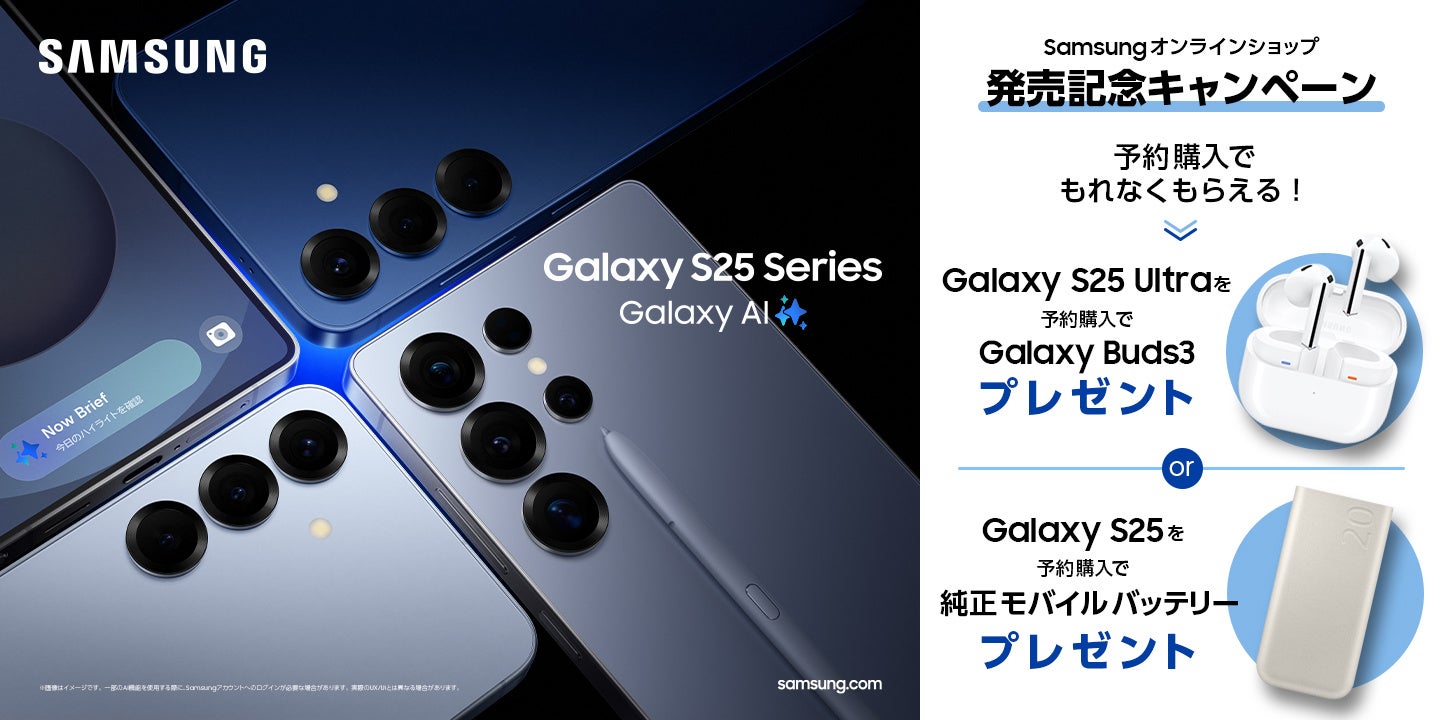 また、本日1月31日(金)より、「Samsung Galaxy S25」「Samsung Galaxy S25 Ultra」(SIMフリーモデル)を予約購入いただくと、対象特典(Samsung純正モバイルバッテリーまたはSamsung Galaxy Buds3)が無料で手に入る「Samsung Galaxy S25シリーズ発売記念キャンペーン」※を実施いたします。