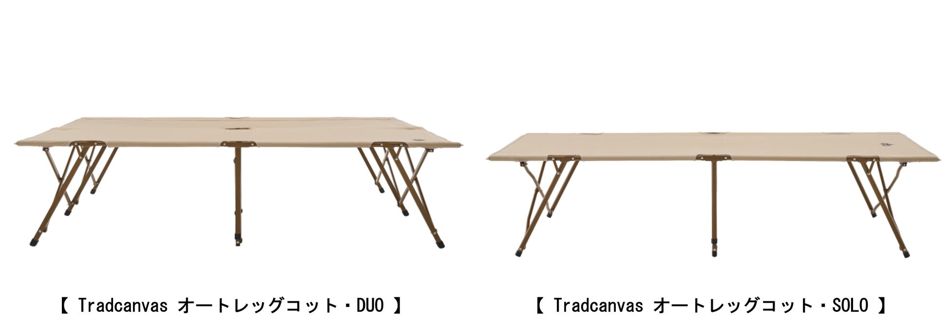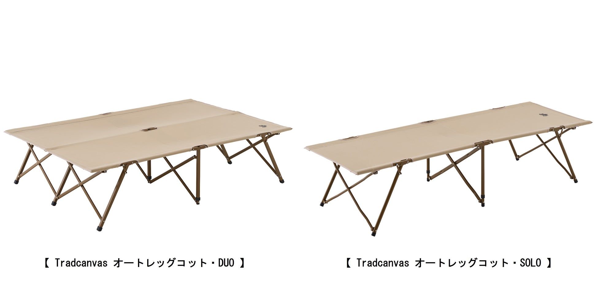 本アイテムは、フレームを上下左右に開くだけで簡単設営できるLOGOS独自のオートレッグシステムを採用した、ハイスタイルのキャンプ用コットです。2人用で耐荷重約240kgの「Tradcanvas オートレッグコット・DUO」と、1人用で耐荷重約120kgの「Tradcanvas オートレッグコット・SOLO」の2種類をラインアップします。