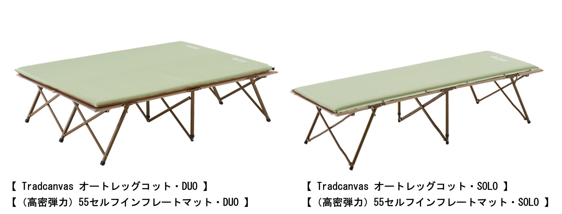 さらに、「Tradcanvas オートレッグコット」2サイズには、それぞれ別売りの「(高密弾力)55セルフインフレートマット」2サイズがぴったりで、組み合わせて使用いただくことで寝心地もよくさらに快適に過ごすことができます。